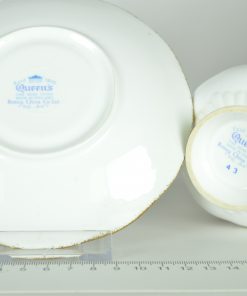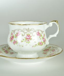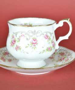 Subtiel gedecoreerde kop met een bol buikje met schotel van Queen’s in de lijn Rosina. Het is voorzien van rozerode bloemen met elegant grijs fantasiemotief. In de rand aan de binnenzijde van het kopje een cluster bloemen. De randen zijn voorzien van een gouden biesje. Aan de onderzijde het stempel van Queen ’s en een nummer. Geproduceerd vermoedelijk omstreeks 1950 in Engeland.