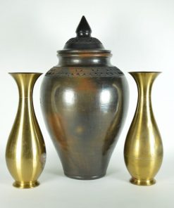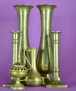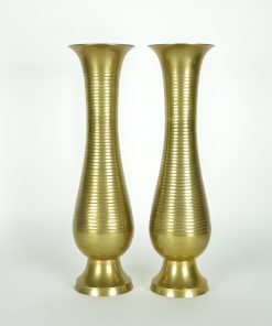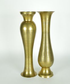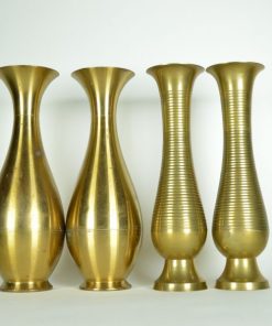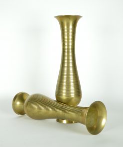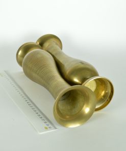 Twee elegant vormgegeven, warm goudgeel koperen vazen gedecoreerd met ringen. Onder het kopje gerelateerde objecten zijn de overige vazen op de foto te vinden.