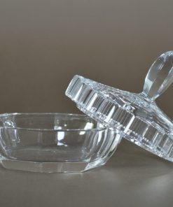 Ovaal doosje van kristal met deksel. De prachtig bewerkte deksel is voorzien van een grote fonkelende greep. Staat schitterend op een toilettafel met kleine sieraden of in de badkamer met badparels of zeep.
