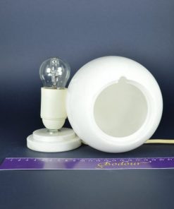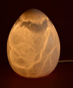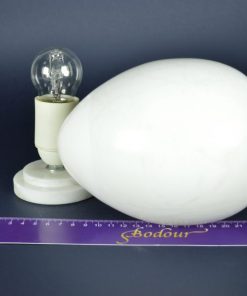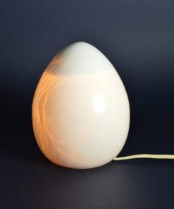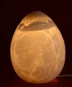Eivormige tafellamp bestaande uit een voet met gloeilamp en een uit albast geslepen eivormige kap. De lamp is wit en aangeschakeld zorgt de transparantie van het natuursteen voor een betoverend lichteffect in sfeervol beige en gelig wit. Grote fitting, max. 25 watt.
