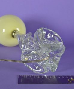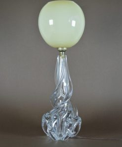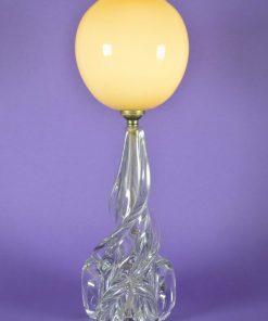Deze zwierige en sierlijk gevormde lampenvoet van kristal komt uit Parijs, Frankrijk. Het is voorzien van een ivoorkleurige glazen bolvormige kap. Het geheel dateert uit de jaren rond 1920. De lamp heeft een bajonet fitting – de gloeilampen worden bij veel ijzerwinkels en speciaalzaken verkocht. In deze lamp zit een gloeilamp van 25 watt, 40 watt is de maximale wattage voor deze lamp. Aan de onderkant van de voet zijn de letters: Cristal J.B.France ingegraveerd.