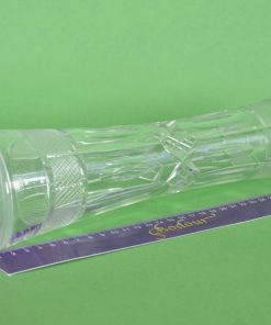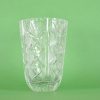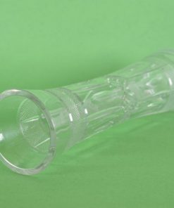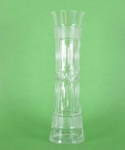 Deze lange glazen vaas heeft een taille, als een bijeengebonden boeket bloemen. Door zijn lengte is hij bijzonder geschikt voor bloemen met een lange steel. Aan de boven- en onderzijde zijn twee banden aangebracht in een wafeltjespatroon, in de taille is hij versierd met een ruitvorm waarin een wat groter wafelpatroon is aangebracht. De vaas is verdeeld in zes vlakken. In de tussen vlakken zijn grote ovalen geperst. De vaas is gemaakt vermoedelijk rond de jaren 1910.