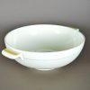 Twee serviesdelen, bestaande uit een melkkan en een diepe schaal: Uit de servieslijn ‘Neerlandia Art Deco’, ontworpen door Andries D. Copier voor glasfabriek Leerdam. Afmetingen kan: 7 cm hoog, 11 cm breed. De groene bordjes op de foto zijn verkocht.