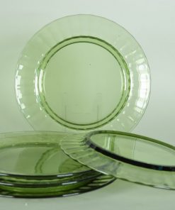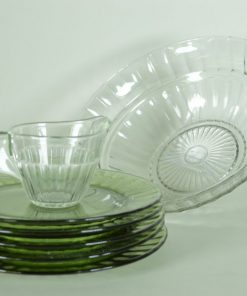Ontbijtservies uit de Huishoudcollectie. Ontwerper: A.D. Copier. Jaar: 1939 Persglas. Het glasservies werd gemaakt tussen 1933-1945, oorspronkelijk als ontbijtservies. Door zijn lage prijs was het, vooral tijdens en vlak na de Tweede Wereldoorlog, zeer in trek. Het servies werd uitgevoerd in de kleur zilvergroen persglas. Alle onderdelen van het servies hebben een golvende wand, waardoor ze een duidelijke eenheid vormen. Rond 1950 gingen ze, uitgevoerd in diverse kleuren, een eigen leven leiden als serviesgoed onder de namen “Hollandia” en “Zeelandia”. (Bron: Catawiki)