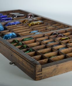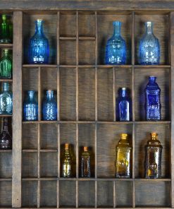 Prachtig letterbak ingericht met glazen flesjes van groen, blauw, bruin en paars glas. Sommige flesjes hebben een kurkje van kunststof.