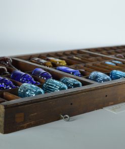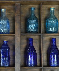 Letterbak met gekleurde glazen flesjes in blauw, groen, bruin en paars