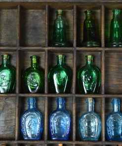 De meeste flesjes hebben een ingeperste afbeelding, een paard of hoefijzer, een mini versie van een mandenfles met rieten imprint of een decoratie van parelbiesjes. De letterbak heeft een verweerde metalen greep.