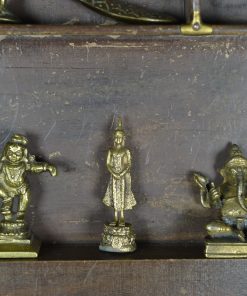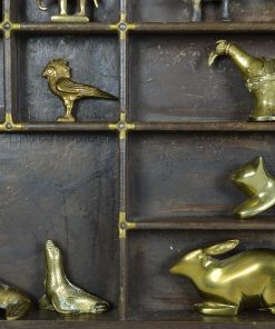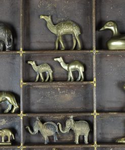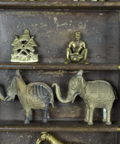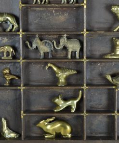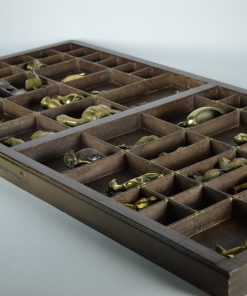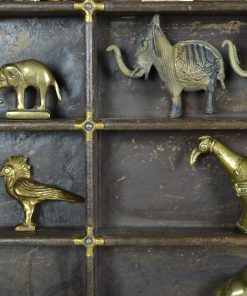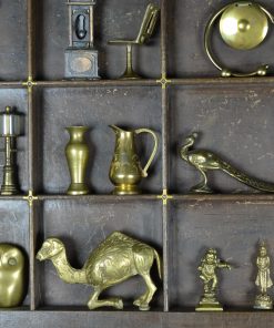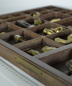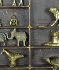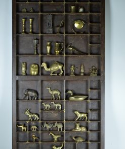 Tegen de achterzijde van deze prachtige letterbak is nog het oorspronkelijke drukpapier te zien. Op de kruising van elk vakje is een koperen versteviging aangebracht. De uitgebalanceerde inrichting bestaat uit een aantal bijzondere objecten uit Nepal en India, zoals een Nepalees symbool, dieren en een aantal Boeddha’s.