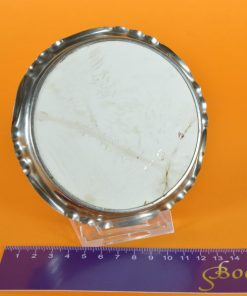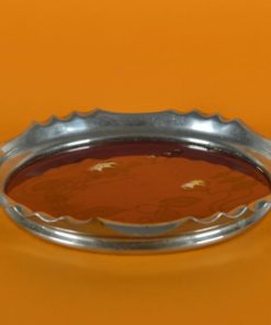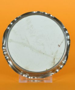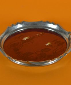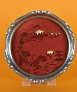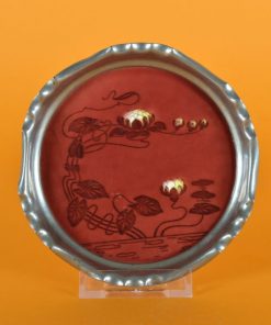 Prachtige kleine onderzetter van porselein met metalen rand. Het motief is lotusbloemen in knop en blad in water, handgeschilderd in een prachtig, sfeervol, warm rood. De waterlelies lijken haast met hun subtiel gekleurde geel en wit in de donkerrode omgeving op te lichten in het donker. In de achterkant een blind porseleinstempel 15 en een handgenummerd 47. Gemaakt in de zwierige, elegante Jugendstil periode, rond de jaren 1910. Beter gebruiken als wanddecoratie omdat hij zo mooi is en vol sfeer.