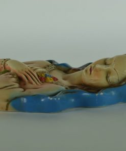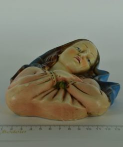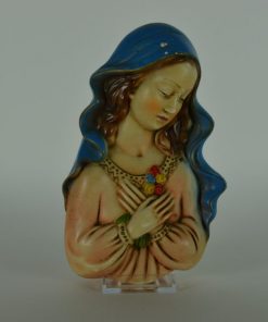 Reliëf voor aan de wand van de jonge Maria, moeder van Jezus. Vermoedelijk Zuid-Europees, Italiaans. Deze Madonna draagt een blauwe sluier en drukt gekleurde roosjes aan haar borst.