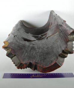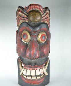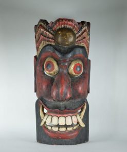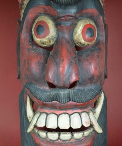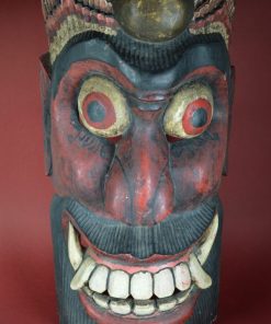 Bijzonder, reusachtige masker van een fakir uit India. Hij heeft bolle ogen, witte tanden en lange hoektanden. Het masker is overwegend rood en donkergroen met zwart van kleur. De hoofdtooi lijkt op een tulband en is opgebouwd uit lagen uit hout uitgesneden en geschilderde veertjes. In het midden van de tulband een gouden halve bol, een sieraad dat wijst op het derde – zieners- oog. Onder de ogen zijn omlijst met prachtig gekrulde wimpers. Deze fakir heeft een platte brede neus, een baard en snor.
