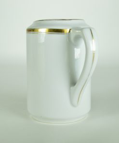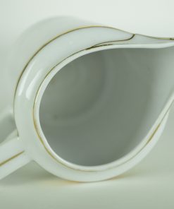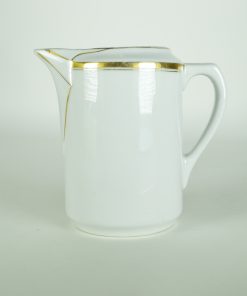 Strak vormgegeven middelgrote kan voor warme of koude melk om thee, koffie of chocolademelk mee aan te lengen. Het grijsachtige wit en de decoratie van simpele gouden lijnen maken hem een prachtig Art Deco kannetje. Geproduceerd vermoedelijk voor 1934.