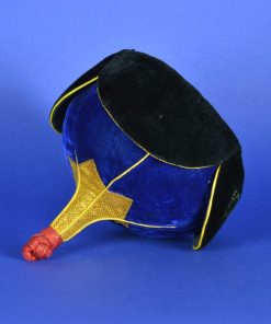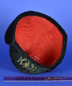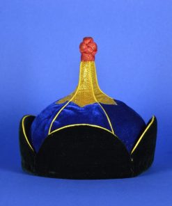Mongoolse helm van zwart en donkerblauw fluweel, afgebiesd met gouden biezen. De brokaten stof bekleedt de stam in het midden, die eindigt in een rode dikke knoop doorweven met gouddraad. Het gouden logo heeft de vorm van een lauwerkrans. De stevige helm is gemaakt van 100 procent katoen. De maat is 5, de diameter is 18 cm.