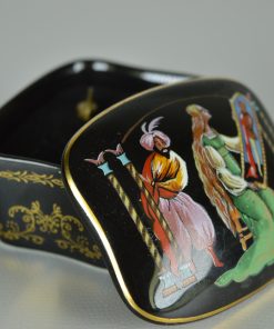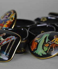 Drie prachtig gedecoreerde muziekdoosjes met een voorstelling van het Russische ballet ‘Schéhérazade’ in de sfeer van 1001 nacht met handgeschilderde accenten. De doosjes met zwarte achtergrond doen denken aan houten Russische lakdoosjes. Onder de deksel een opwindmechanisme met een stukje muziek uit de betreffende opera. Geproduceerd door Franklin Mint in de USA in 1988. Aan de onderzijde gemarkeerd. Er zijn in totaal vierentwintig muziekdoosjes in verschillende vormen met scènes uit Russische balletten.