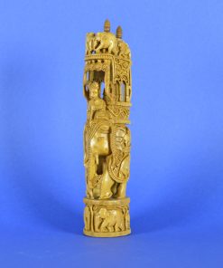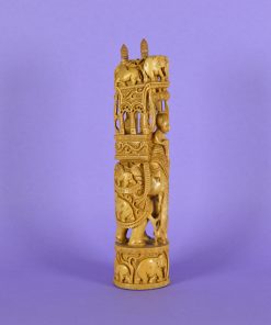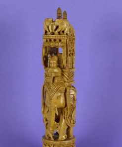 Prachtig gedetailleerd gedecoreerd beeld van een olifant met draagstoel, in alle weelde en rijkdom. Achter de berijder zitten twee personen In de draagstoel. Onder en bovenzijde zijn voorzien van versieringen in florale motieven, kleine olifanten, leeuwen en een pauw. Het object is gesneden uit een stuk heerlijk geurend sandelhout. Handgesneden in het Indiase Rajasthan.