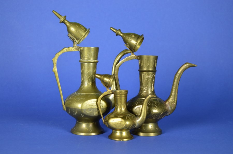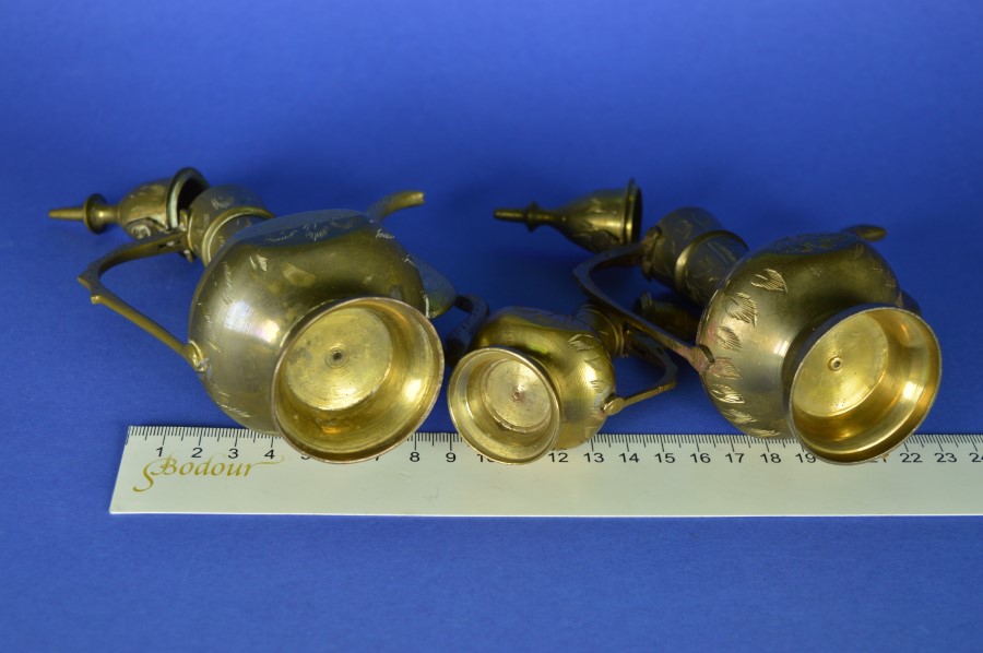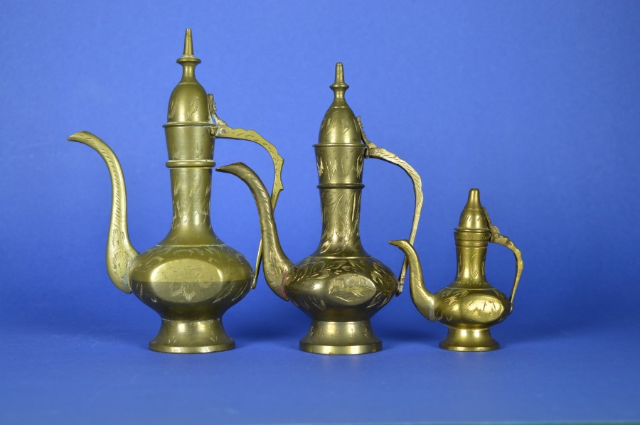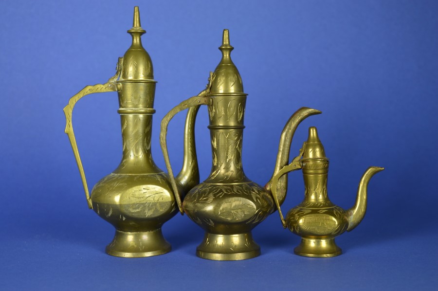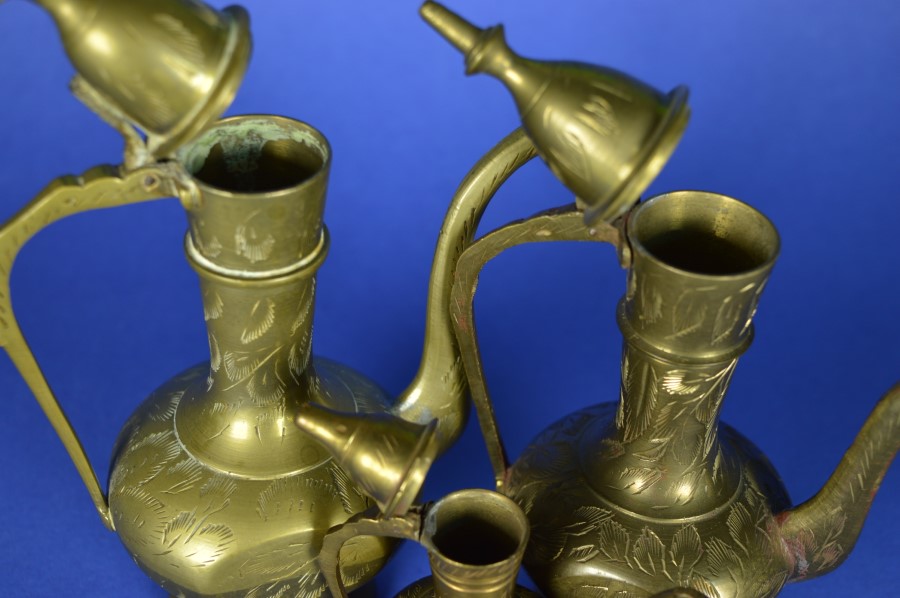 Set van drie sfeervolle, decoratieve kleine schenkkannen, met een elegante lange hals, handvat en tuit. De zijkanten zijn afgeplat. De kannen zijn prachtig versierd met ingegraveerde florale motieven. Aan de onderzijde op 2 kannen de tekst: India en een nummer. Handvat en deksel zijn met klinkers vastgeklonken. De deksels sluiten uitstekend.