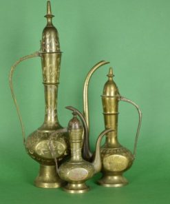 Set van drie sfeervolle, decoratieve Indiaase schenkkannen, prachtig vormgegeven met een elegante lange hals, handvat en tuit. De zijkanten zijn afgeplat. De kannen zijn prachtig versierd met florale motieven. Aan de onderzijde is met kleine puntjes weergegeven: India en een nummer. Op de kleinste kan zijn sporen van rode en roze kleuring te zien. Handvat en deksel zijn met klinkers vastgeklonken.
