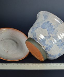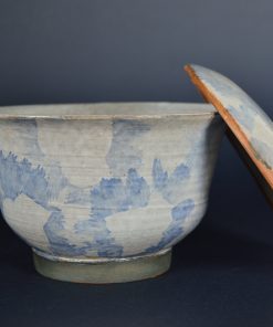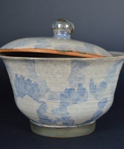Unieke pottery pot met deksel met ronde greep. Iets wijd uitlopend naar boven. Kom en deksel zijn handgemaakt en gekleurd en geglazuurd aan binnen en buiten zijde. Duidelijke zijn de ringen in reliëf zichtbaar onder het in de vorm van boomblaadjes hemelsblauwe als wolken gekleurde en geglazuurde decor. Voor kleine voorwerpen ook in keuken of badkamer.