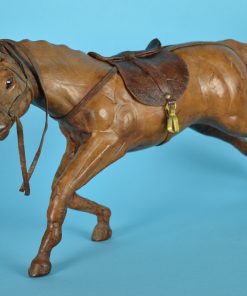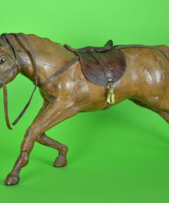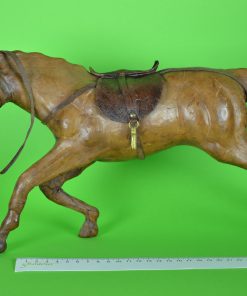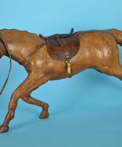 Prachtig, lichtbruin paard, ruikt heerlijk naar leer. Het gaat in enthousiaste galop, de spieren en pezen gespannen. Het draagt een zadel en hoofdstel. Gemaakt in het midden van de vorige eeuw.
