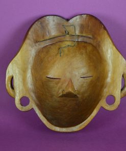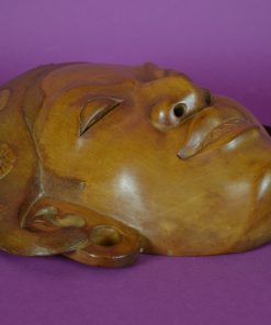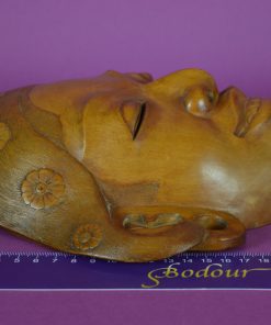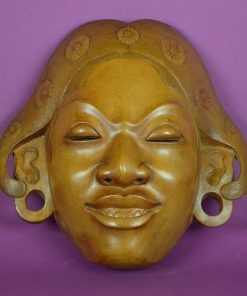 Prachtig masker van een prachtige vrouw met bloemen in het haar. Het haar is heel fijn uitgesneden. Zij draagt grote oorringen. De lieve glimlach toont haar tanden.