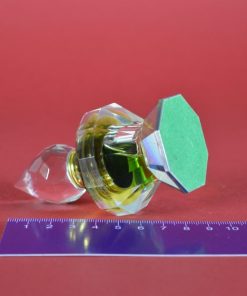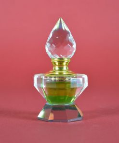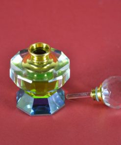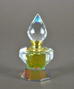 Dit parfumflesje van kristal komt uit India. De esoterische olie of het parfum waarmee het gevuld kan worden blijft veilig en heel lang houdbaar in dit flesje met schroefdop. In de dop steekt een glazen staafje waarmee de olie of parfum opgebracht kan worden.