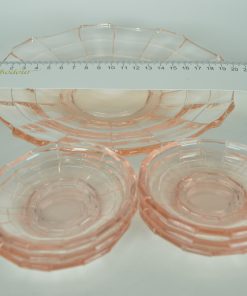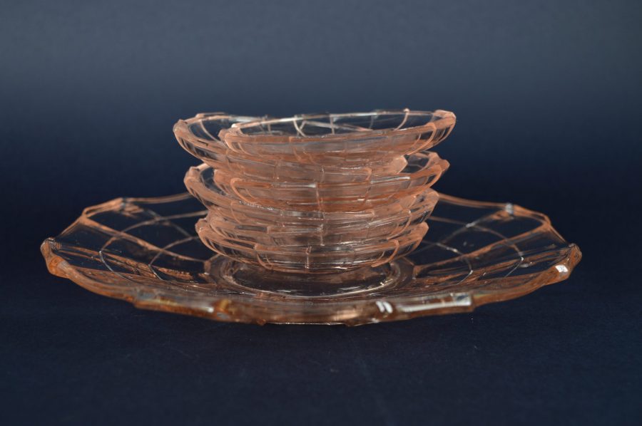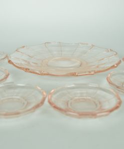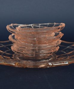 Prachtige feestelijke petitfour bordjes, een grote en zes kleine, van persglas met een ingeperst ruiten patroon van lijnen. Diameter van het kleine bordje is 8.5 cm.
