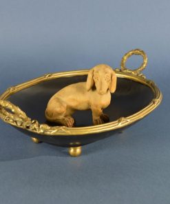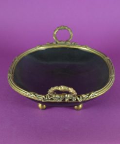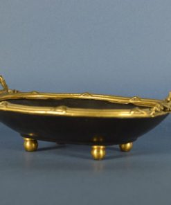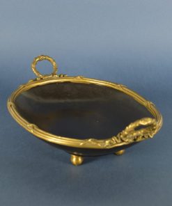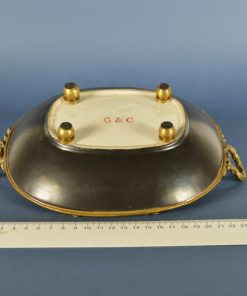 Deze prachtige, strak vormgegeven bijzondere ovale schaal in Empire stijl staat op vier koperen bolvormige voetjes. Het heeft een koperen rand in de vorm van samengebonden takken en oren als lauwerkransen. Aan de onderzijde gemerkt met een rood stempel G & C. Vermoedelijk geproduceerd rond 1900.