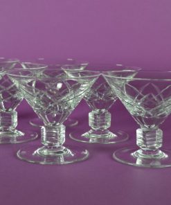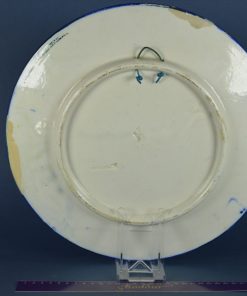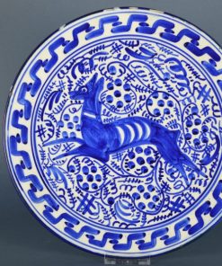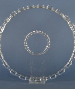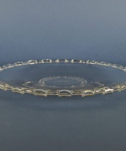 Platte schaal van een bijzondere kleur gras groen glas. Vanuit het centrum met twee ringen met een stippatroon wijzen strepen als stralen naar de buitenkant. De schaal heeft een opstaande rand. Vermoedelijk gemaakt in de jaren rond 1930.