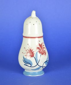 Vrolijke, zonnige poederstrooier uit de serie poederstrooiers van bekende ontwerpers. Dit door Elizabeth Arden ontworpen exemplaar is gedecoreerd met uitbundig zwierige bloemen in rood en blauw met aan de bovenzijde van de strooier in porselein een ontluikende bloemknop. Geproduceerd rond eind jaren eind 1970 en begin 1980.