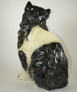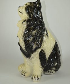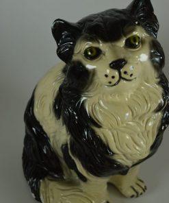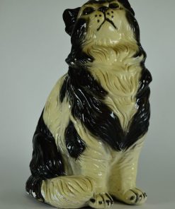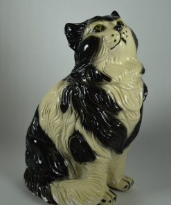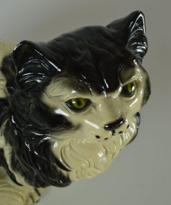 Prachtig gedetailleerde imposant poezenbeeld met hypnotiserende ogen en een eigenzinnige uitstraling, zoals alleen een kat dat heeft en waardoor je gefascineerd blijft kijken. Deze zwart-witte Europese langharige kat doet denken aan de kat uit het verhaal van Alice in Wonderland, Cheshire Cat of Kolderkat., de mysterieuze, pratende kat die een grote rol speelt in dat verhaal. Vermoedelijk gemaakt in de eerste helft van de 20e eeuw in Italië