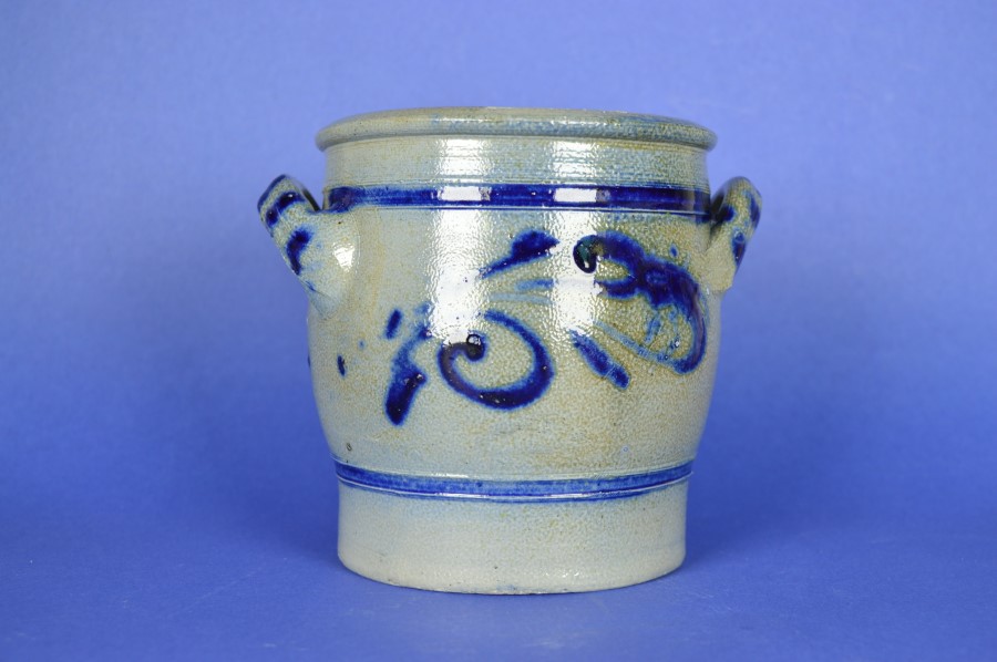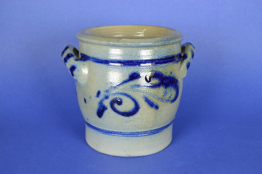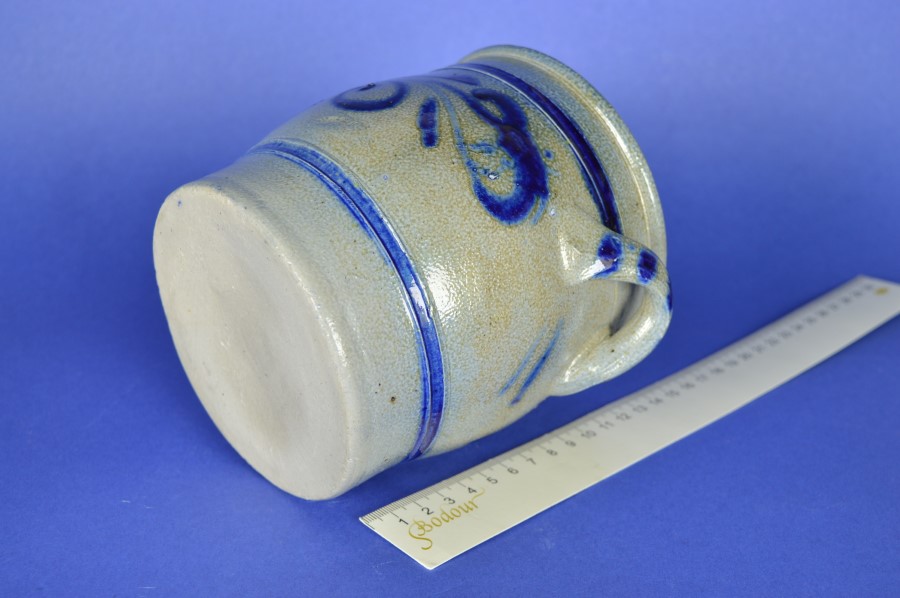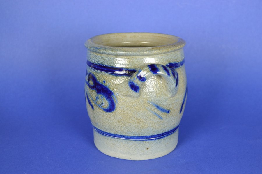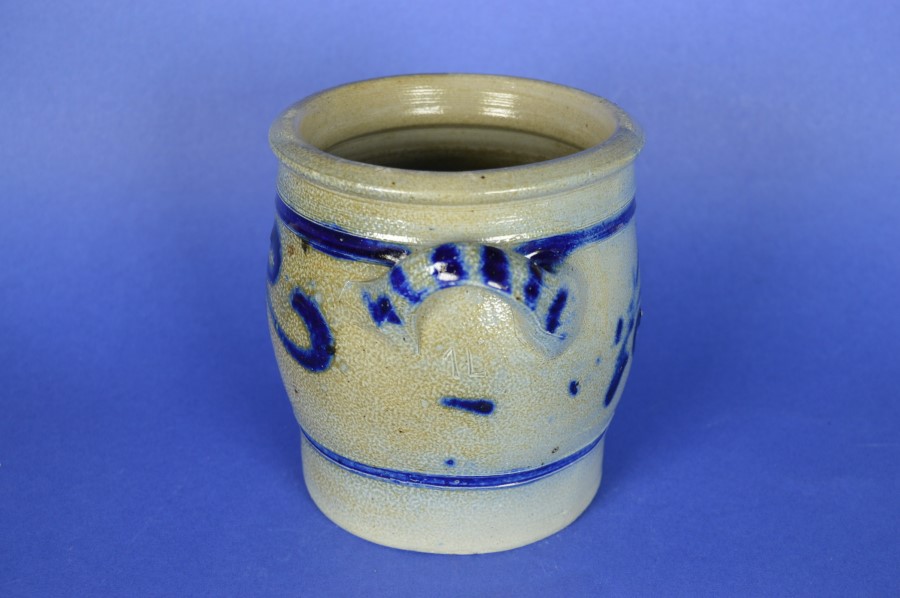 Keulsepot met twee oren en ultramarijn blauwe strepen en fantasiepatronen. Onder 1 van de oren in een blindstempel: 1 L, dus met een inhoud van 1 liter. Handig als opslagpot voor etenswaren of zout. Superleuk voor bijvoorbeeld pollepels.