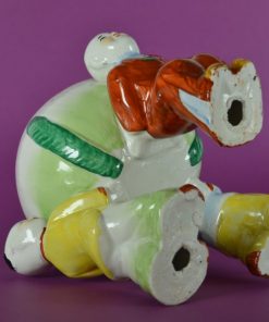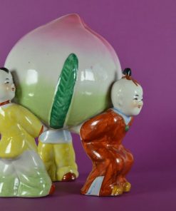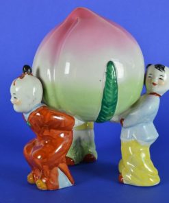 Reuzen perzik van porselein, gedragen door drie vrolijke sterke Chinese kinderen in een blauw, geel en oranje jasje. In China staat de perzik symbool voor een lang leven of onsterfelijkheid.