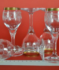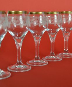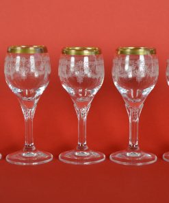 Set van vijf portglazen met een feestelijke, elegante op fijne kant lijkende opdruk van guirlandes en fantasiepatronen. De rand van kelk is afgewerkt met een gouden bies. De stam heeft vier facetten waarvan de hoeken uitlopen uit in vier glazen blaadjes. Geproduceerd vermoedelijk rond 1950.