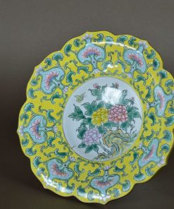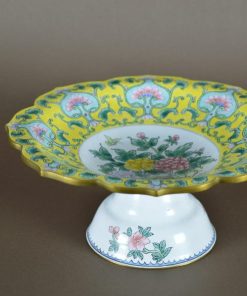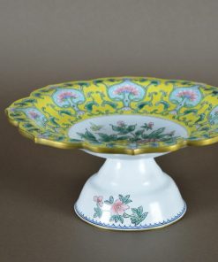 Prachtige onbreekbare presenteerschaal op voet, in het Chinese famille rose yellow ground motief. Het centrale deel toont een heuvel met bloemen en een vlinder. In de rand zwierig vormgegeven lotusbloemen. De voet en de schaal zijn afgewerkt met een koperen rand.