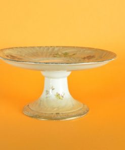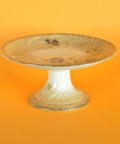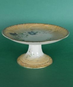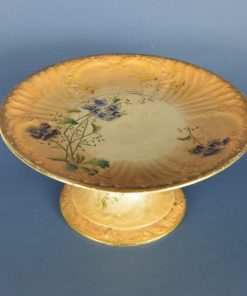 Romantische, bijzonder sfeervolle presenteerschaal op voet, in reliëf  gedecoreerd met blaadjes met parelrand en krullen. De gouden randen verlopen via een mat geglazuurd perzikkleurig gedeelte naar een glanzend ivoorwit geglazuurd gedeelte. De stam en het centrale deel van de schaal zijn glanzend ivoorwit geglazuurd. Fijn gedecoreerd met blauwpaarse viooltjes en geelrode bloemen met bladgroen. Geproduceerd tussen 1930 en 1950.