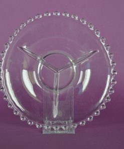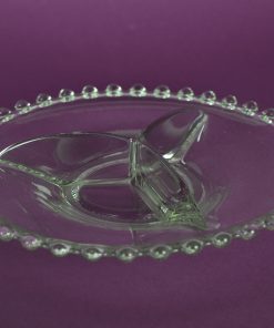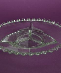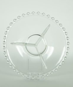 Presenteerschaal van glas met glazen balletjes en drie vakken