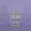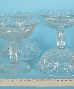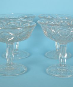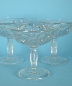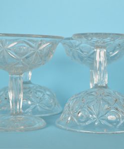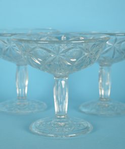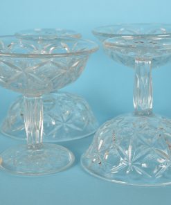 Feestelijke, stevige dessertcoupe met wijd uitlopende kelk. De coupe staat op een stam met verticale ribbel, op een bewerkte voet. Het ingeperste fantasiemotief bestaat uit sterren en cirkels De coupe is gemaakt in de periode rond 1970, retro.