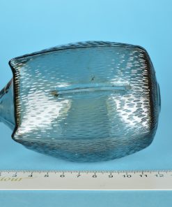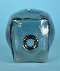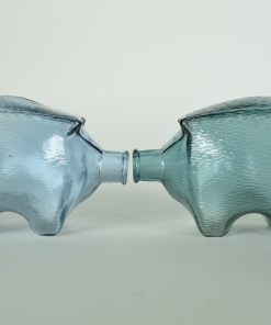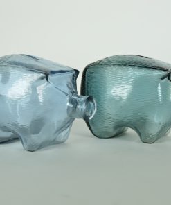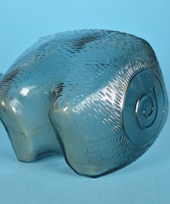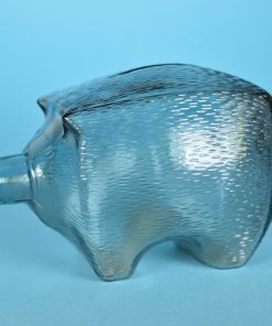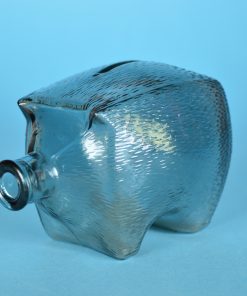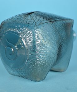 Origineel, gestileerd vormgegeven Fins spaarvarken. Het heeft een gleuf in de rug voor muntgeld en een ronde open snuit voor opgerold papier geld. In het geperste glas zijn haartjes, een staart en ogen te zien.