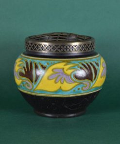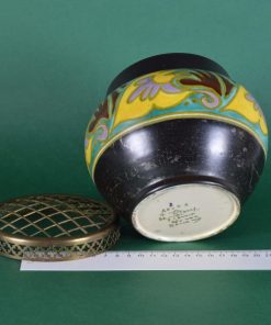Deze kleurrijke uitbundige en toch ingetogen rozenbowl is beschilderd in een meerkleurige florale free-style. De verdeler van de bloemen is van koper, met een mooi bewerkte rand. Aan de onderzijde een niet goed leesbare tekst. Het huis met dak toont de typische poort van Gouda Plazuid. Het pijltje geeft het jaartal aan, in dit geval1929 als fabricage datum. Decor is “Akoka”.
