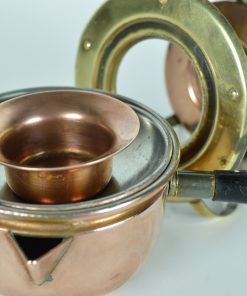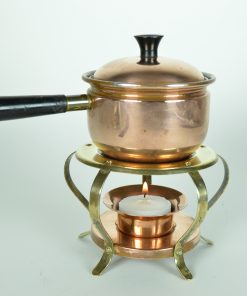 Feestelijke, sfeervolle mini pan met rechaud in glimmend geel en rood koper. De pan heeft een geprononceerde schenktuit en afschroefbare hittebestendige greep. De greep aan de deksel is ook hittebestendig. Het geheel wordt verwarmd door een waxinelichtje. Aan de onderzijde van de kaarshouder staat ‘made in Switserland’. De rechaud is stoer vormgegeven met industriële nagels aan de bovenzijde.