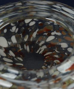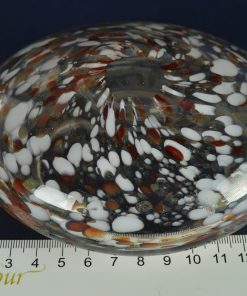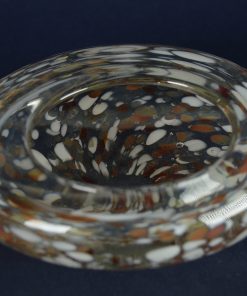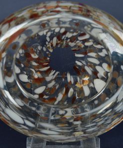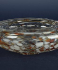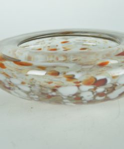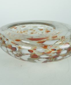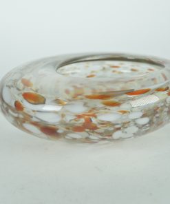 Prachtig ovaal schaaltje geblazen uit kleurloos glas met gekleurde bloedrode en witte vlekken. Vormgegeven met de opening uit het midden.