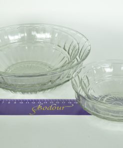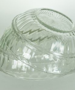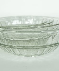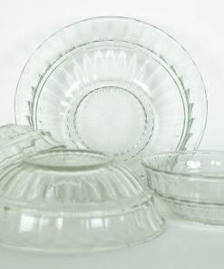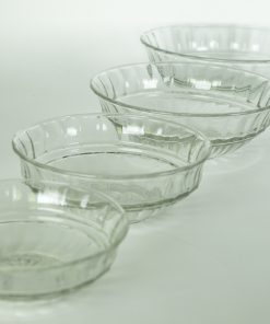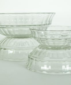 Set van vier schalen uit het servies ‘Neerlandia Art Deco’, uitgevoerd in kleurloos persglas. Ontworpen door Andries D. Copier voor glasfabriek Leerdam, werd het geproduceerd tussen 1933 – 1945, oorspronkelijk als ontbijtservies.