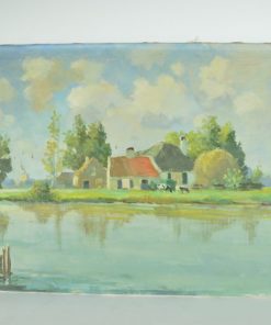 Zonnig en vrolijk olieverfschilderij met een oer-Hollands landschap, waarschijnlijk uit de omgeving van Uithoorn. Het jaargetij is vroeg zomers. Het is een rustig landschap met schapenwolken in de lucht, een boerderij met koeien en een hooiberg, spiegelend water en roeibootjes. Een werkschuit met schipper en gehesen zeil drijft het landschap binnen.