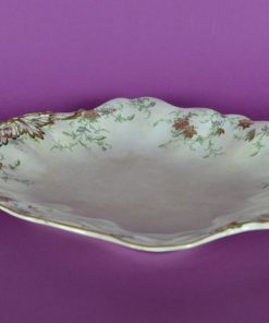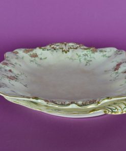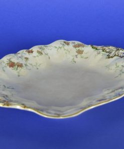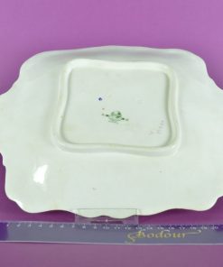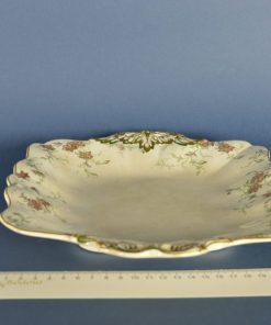 Bijzondere, prachtige antieke vierkante schotel met geschulpte rand, fijn gedecoreerd met een motief van groene takjes met bordeauxrode bloemen en bloemknoppen omlijst met gouden biesjes. De grepen aan de zijkant zijn licht naar buiten gebogen en beschilderd in een donkergroen en gouden verenmotief. De basis kleur is grijzig wit. Geproduceerd door Mintons Engeland in de lijn Ursula rond 1890, bijna 130 jaar geleden.