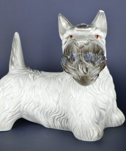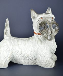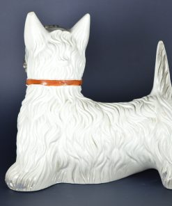 Bijzonder goed getroffen uniek beeld van een pittige witte Schotse Terriër. Met z’n grijs-zwarte snuit, mooi bewerkte haren, rode ogen en halsband, een feest om naar te kijken.