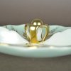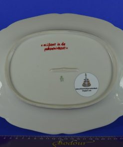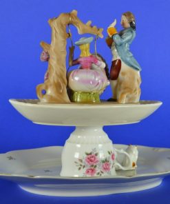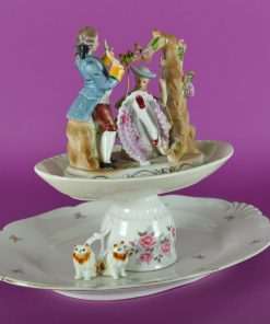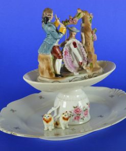 Deze grappige, feestelijke en unieke etagère gemerkt ‘Olifant in de porseleinkast’, bestaat uit twee lagen. De onderste etage gevormd door een schaal met een omgekeerd theekopje en twee verveelde poezen, en de bovenste etage een voorstelling van een Frans-adellijk tafereel van porselein. Het stelletje vermaakt zich met een schommel aan een boom. Een feest om naar te kijken.