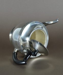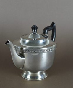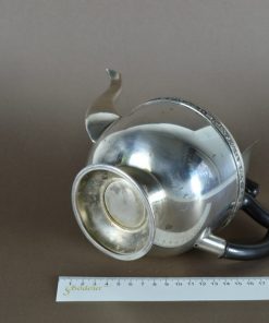 Deze verzilverde theepot met handgrepen van bakeliet is gemaakt tussen 1920 en 1940. Langs de rand van de strak vormgegeven, stijlvolle theepot is een bies aangebracht met binnen een subtiele dubbele parelrand een guirlande van takjes met blaadjes, afgewisseld met een ruitvormig of vierkant blokje. Op de bodem staat gegraveerd: Alpha plate Viners de Sheffield England corporate, the cutlers company 1836. Het merk Alpha Corporate was in gebruik bij Viners vanaf 1925.