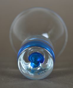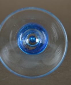 Bijzonder vormgegeven, feestelijk shotglaasje of borrelglaasje met in de zware stabiele voet een blauwgekleurde druppelvormige uitsparing. Geproduceerd door Krosno in Polen, in de Bonny lijn.