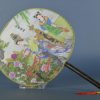 Zeldzaam, sfeervol sierbord met een voorstelling van kraanvogels in een Japans landschap met een stromend beekje, naaldbomen en en struik met bloedrode blaadjes. Prachtige details in schitterende, heldere kleuren. Aan de onderzijde Japanse karakters in ijzerrood.