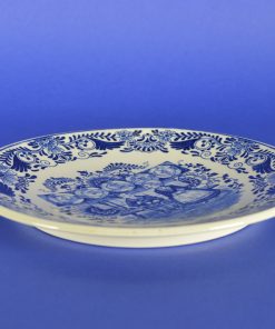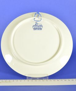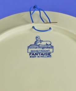 Gezellig wandbord met een handgeschilderde oudhollandse kindervoorstelling, uitgevoerd in blauw op wit. Het bord toont een afbeelding van twee kinderen in klederdracht. Het jongetje houdt een ouderwetse koffiemaler tussen de knieën, het meisje heeft een kopje koffie op schoot. Achter de kinderen is een soort stripverhaal te zien, vijf kaders met iconen van Holland zoals windmolens. De rand van het bord toont het welbekende oudhollandse bloemmotief. Op de achterzijde een porselein stempel van de firma Petrus Regout & Co, Maastricht, Fantaisie, made in Holland. geproduceerd rond 1950.